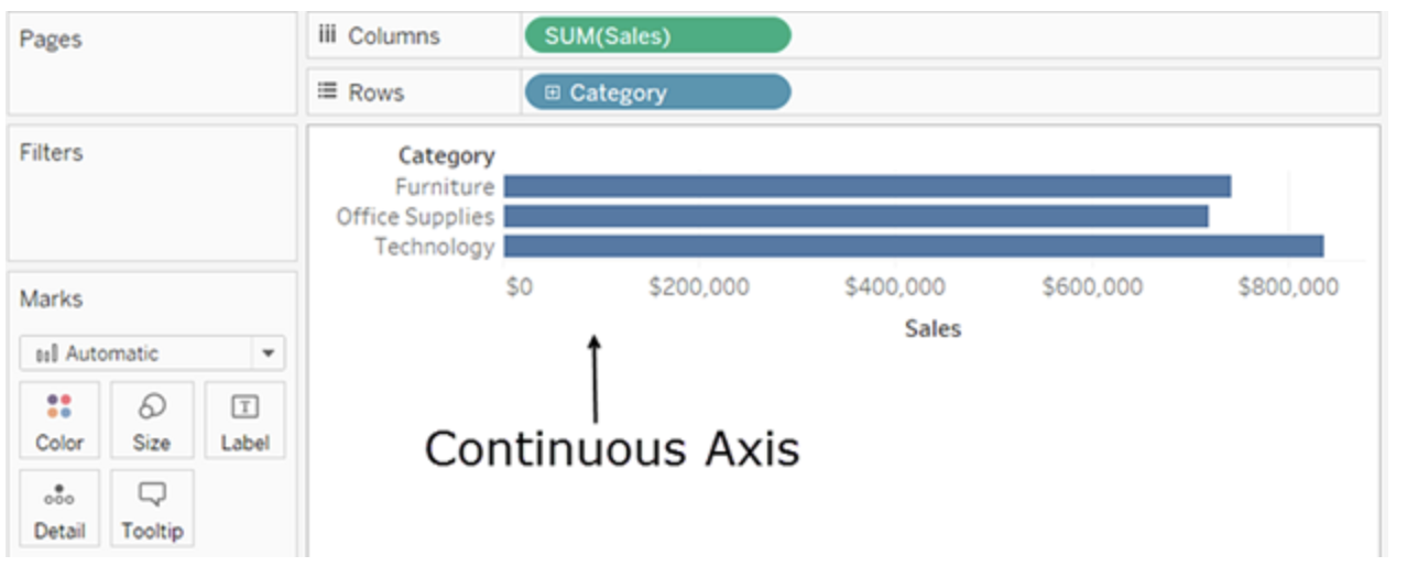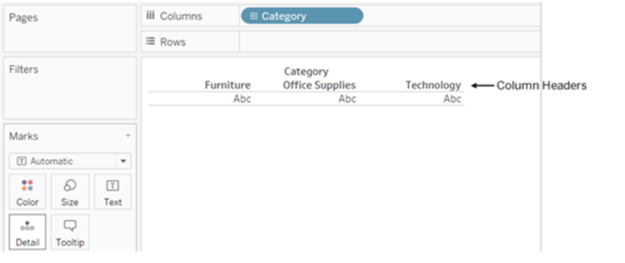 - when you drag a discrete dimension field to Rows or Columns, Tableau creates column or row headers.