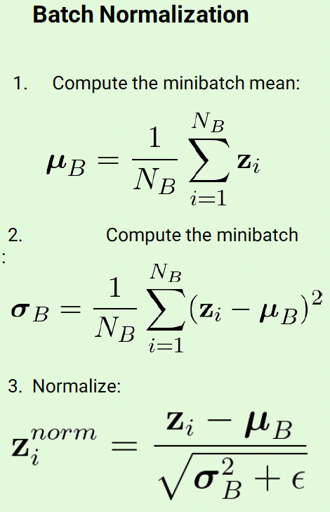 - Similar to input normalization, but computed at a minibatch level in the internal layers