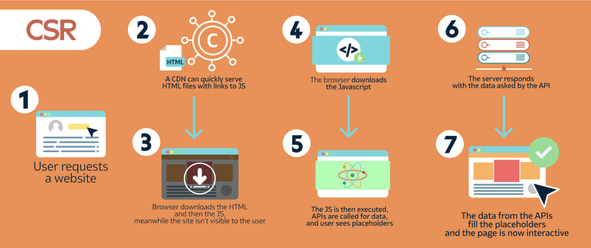 사용자 상호작용이 빠르지만, SEO에 불리하다. 초기 로딩 속도가 느리지만, 이후 페이지 로딩 속도는 빠르다.