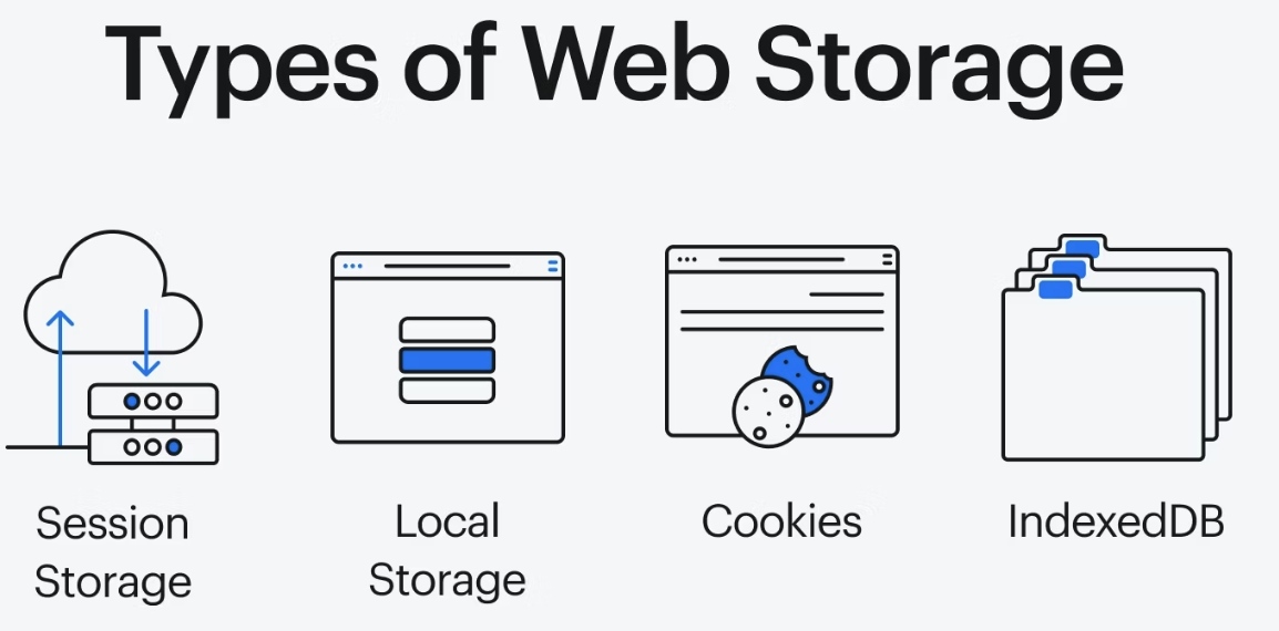 - 쿠키: 만료 기간이 있는 Key, Value 형태의 저장소로, 사용자의 설정이나 로그인 정보를 저장하는 데 사용된다. 각 HTTP 요청 시 서버에 함께 전송되며, 용량은 약 4KB로 제한적이다. 보안 문제를 고려하여, 최신 브라우저는 쿠키의 도난 위험을 줄이기 위한 다양한 보안 정책을 적용하고 있다.