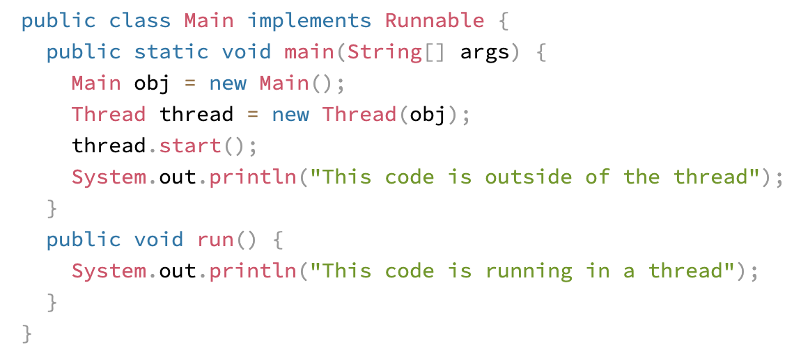 - If the class implements the Runnable interface, the thread can be run by passing an instance of the class to a Thread object's constructor and then calling the thread's start() method.