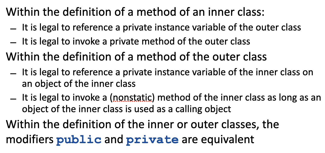 - If the inner class is private, then the inner class cannot be accessed by name outside the definition of the outer class.