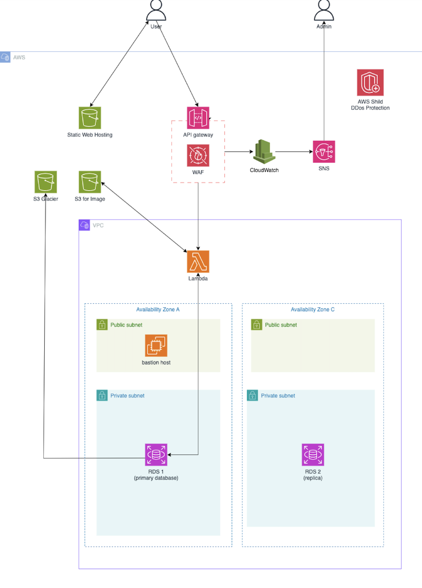 IAM, WAF, Cloud Watch, VPC, Lambda, EC2, RDS, S3, API Gateway, SNS 등의 많은 서비스를 실제로 구현해보면서,