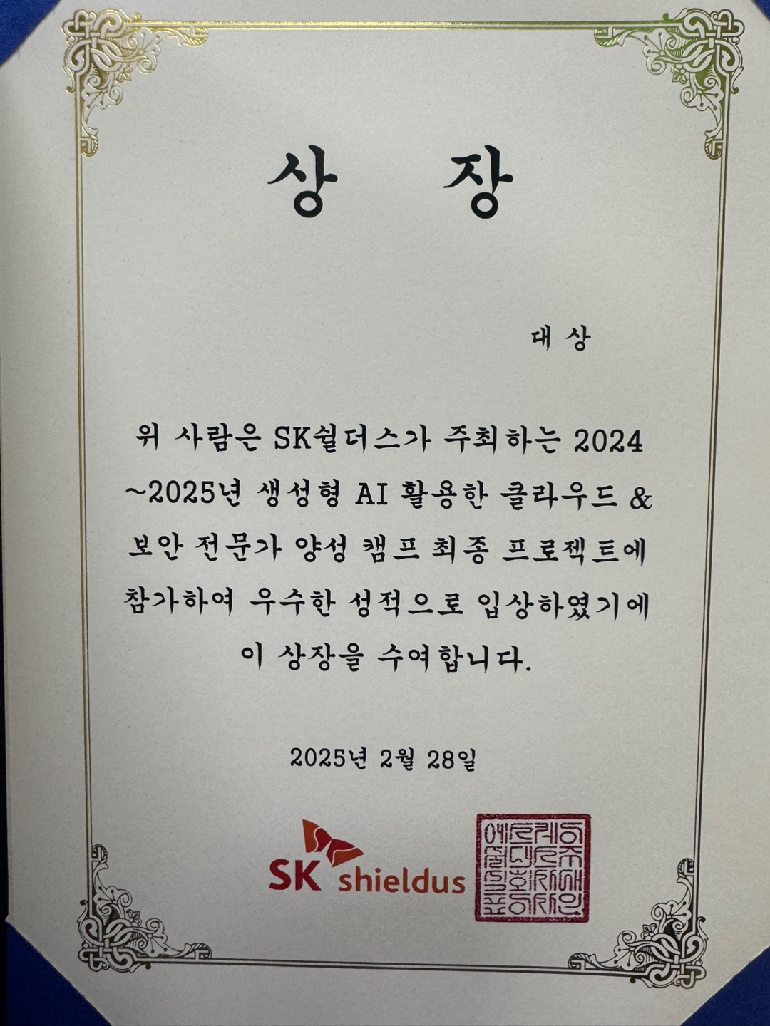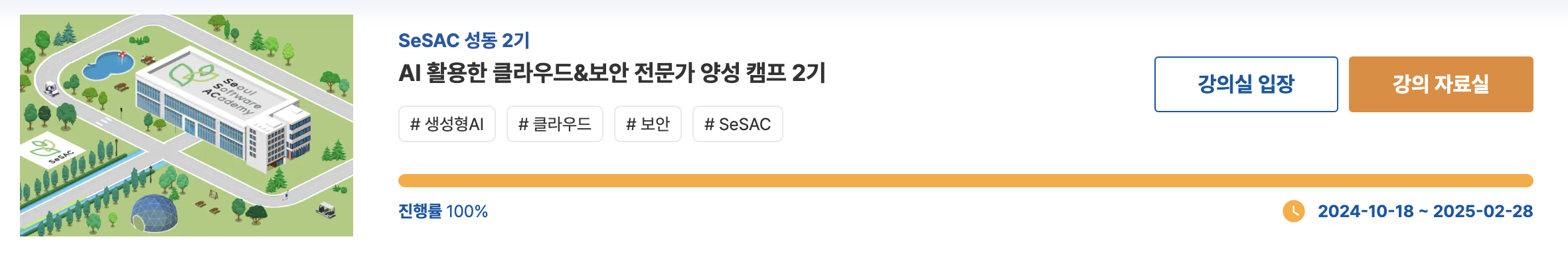 paka_corn 2025. 2. 28. 21:502024.10월 18일부터 시작해서 2025.02.28일까지 진행되었던 [새싹 성동 2기] 생성형 AI 활용한 클라우드&보안 전문가 양성캠프 수료 후기입니다.
